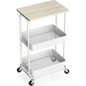 Simple Houseware 2-Tier Rolling Utility Cart with Lockable Wheels and Wood Top, Metal Storage Organizer Trolley for Kitchen, Bathroom, Office, Craft Room, Maple(White)